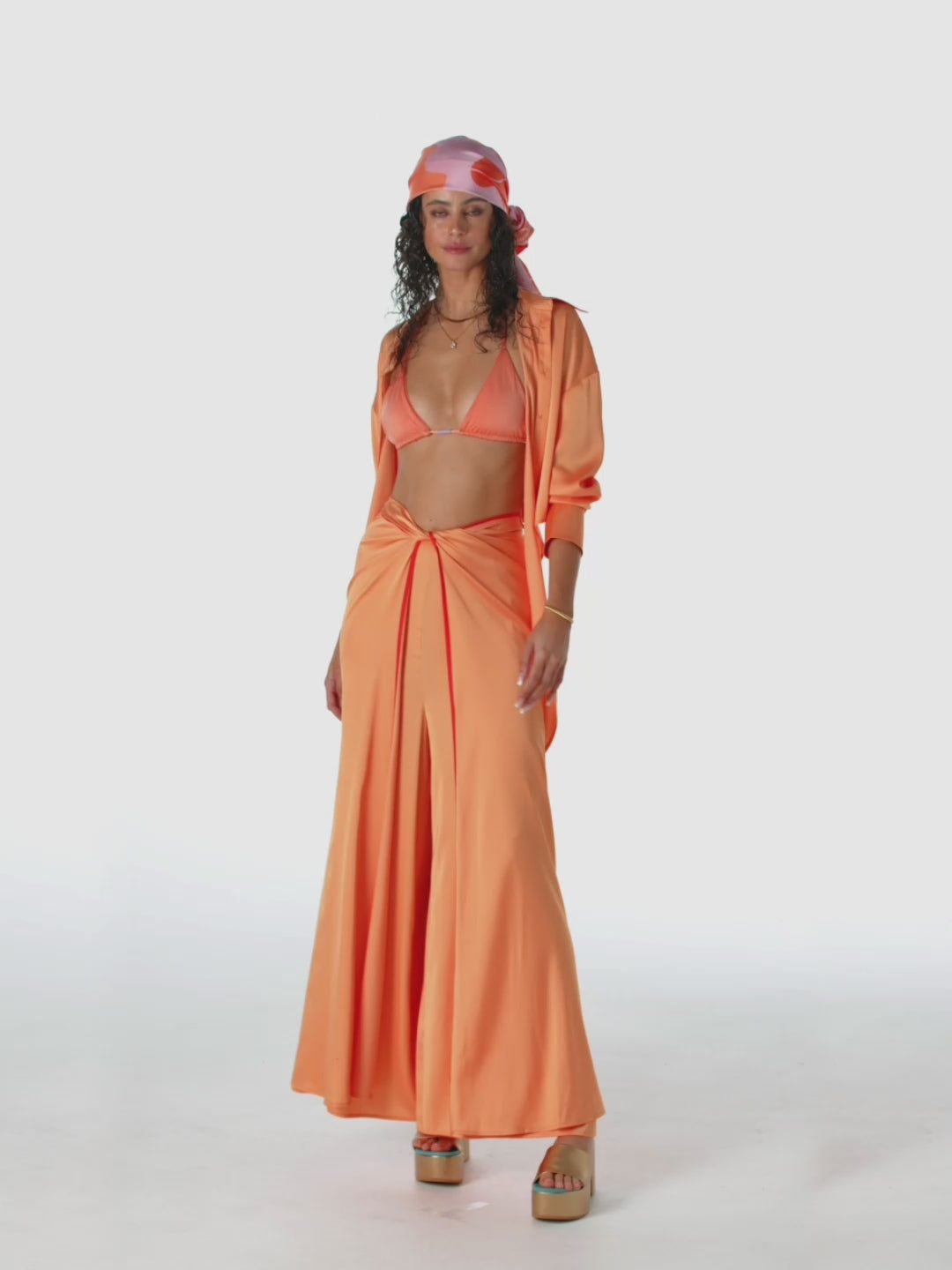 Soft and light satin wide leg pant with versatile wrap outer layer and hidden side pockets.