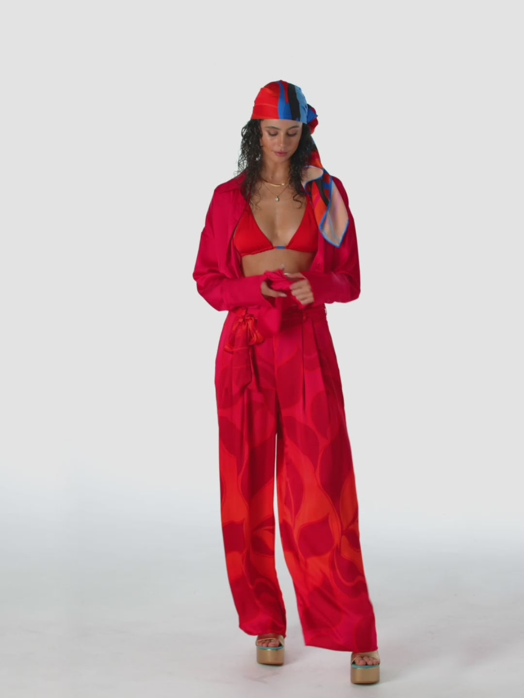 Button down collared shirt with versatile tie front and matching nylon coated metal buckle. Shirt features a dropped shoulder and exaggerated 3 button cuffs.
