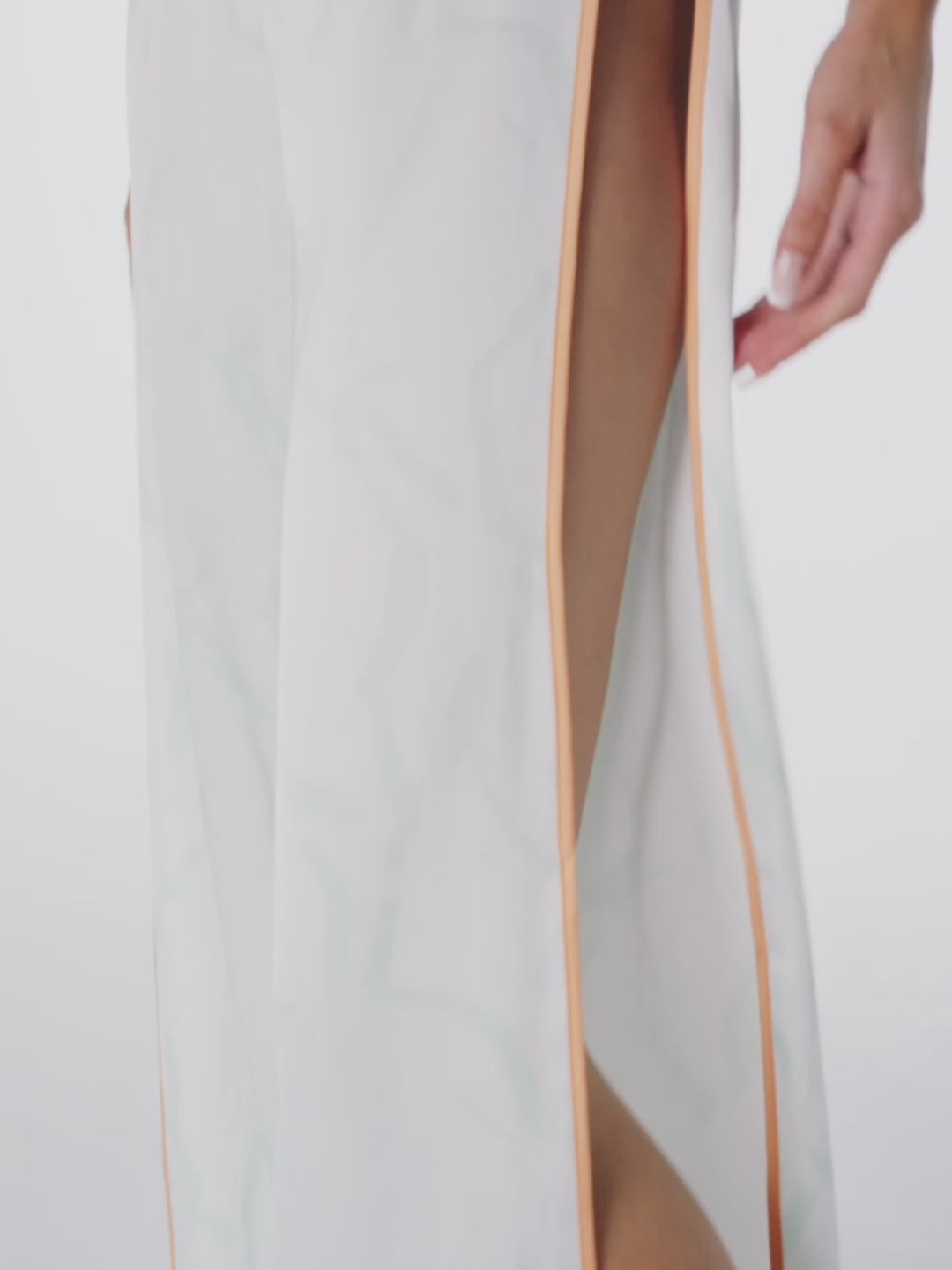 Buttery soft satin pants featuring open sides, accented with contrasting peach satin binds and secured with matching matte coated metal rings.
